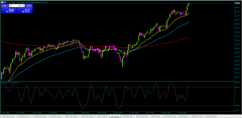 قیمت نفت خام در معاملات هفته جاری با اعلام پای¬بندی کشورهای اوپک به توافق کاهش تولید، جهش کرد. عبور قدرتمند قیمت از نمایی 200 و کراس نمایی 20 به بالای آن ها نشان می دهد قیمت تصمیم به شل کردن روند صعودی خود ندارد و بعلاوه قیمت همواره در اشباع خرید استوکستیک قرار گرفته که نشان می دهد قدرت خریداران تا چه حد بیش از فروشندگان است. از طرفی با شکست سقف دوقلوی 53.80 قیمت به مسیر خود ادامه داد و وارد اشباع خرید استوکستیک شد تا افزایش قدرت خریداران را شاهد باشیم.