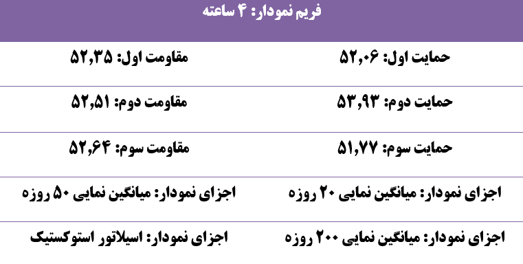 قیمت پس از رسیدن به اشباع فروش روی نمایی 50 کندل برگشتی زده و رشد قیمت داشته است. اگر قیمت بتواند روی مقاومت 52.35 تثبیت شود تا نمایی 20 روزه و مقاومت 52.64 خواهد رفت و شکست این خط نمایی نقطه مناسبی برای خرید تا 53 می باشد. اما اگر قیمت برگشته و نمایی 50 را بشکند تارگت اول معادل 51.77 خواهد بود. هرچند قرار داشتن قیمت در اشباع فروش، احتمال سناریوی دوم را تا حدی کاهش می دهد.