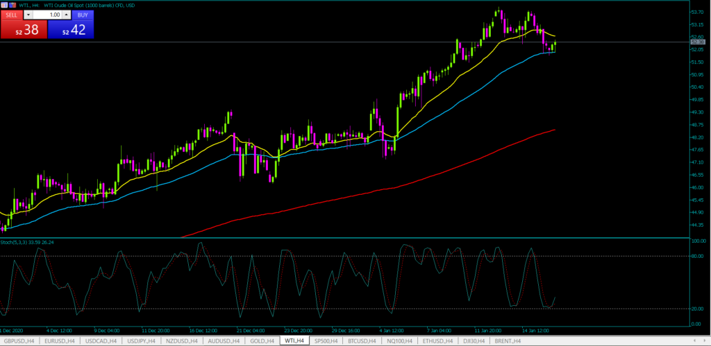 افزایش امیدواری نسبت به بهبود شرایط اقتصادی با مهار کرونا در جهان با رشد قیمت همراه شد. از سوی دیگر کاهش حجم ذخیرهسازی نفت در جهان نیز زمینه را برای رشد قیمتها فراهم کرده است تا نفت امریکا تا 54 دلار را نیز به خود ببیند. همچنین از دیدگاه تکنیکالی، قیمت روند صعودی داشته است. تشکیل کف های قیمتی بالاتر 49.53 ، 50.38 و 51.48 نشان می دهد قیمت با تشکیل دره های بالاتر همچنان در روند صعودی خود باقی مانده است و مادامی که قیمت به زیر نمایی 50 کشیده نشود همچنان قیمت روند صعودی خود را از دست نداده و هم چنین کراس نمایی 20 و 50 به سمت پایین شکل نگرفته که نشان می دهد این افت قیمت یک اصلاح قیمتی است.