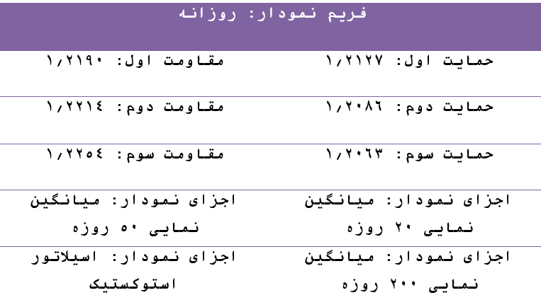 قیمت به تازگی از مقاومت نمایی 20 روزه گذر کرده و امروز در حال تست کردن آن است و اولین مقاومت 1.2190 در بالای قیمت قرار گرفته و اگر قیمت بتواند این مقاومت را بشکند علی رغم ورود استوکستیک به اشباع خرید اما به دلیل افزایش قدرت خریداران، نقطه مناسبی برای ورود تا مقاومت 1.2214 خواهد بود. همچنین اگر قیمت مجددا به زیر حمایت اول خود برگشته با نمایی 50 مواجه می شود که در صورت تشکیل کندل برگشت و افزایش حجم خریداران میتوان برای ورود تا سطح نمایی 20 و پس از آن تا مقاومت اول اقدام کرد.