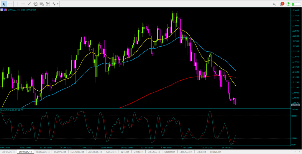 در ماه گذشته یورو در مقابل دلار روند نزولی داشته است. تقویت ارزش دلار آمریکا، افت 5 درصدی تولید ناخالص داخلی آلمان در سال 2020، بحران سیاسی در ایتالیا و توزیع کُند واکسن کرونا در اروپا باعث تضعیف ارزش یورو در برابر دلار آمریکا شدهاند. از نظر فنی نیز این ریزش قیمت مشهود است. شکست قوی ترین حمایت یعنی نمایی 200 روزه و پولبک به آن، همچنین ریزش نمایی 20 و 50 روزه و همچنین کراس نمایی 20 روزه به زیر نمایی 200 روزه نشان از ادامه روند صعودی است و حرکت نمایی 50 به زیر نمایی 200 این روند ریزشی را تقویت می کند.