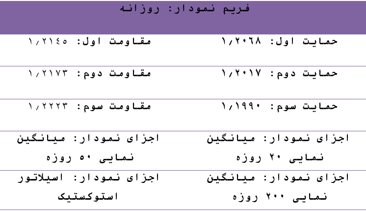قیمت پس از شکست نمایی 20 و 50 روی این سطح نوسان داشته که از تشکیل دوجی قیمتی مشخص است. اگر قیمت بتواند مقاومت اول را رد کند به معنای تثبیت شکست نمایی 20 و نقطه مناسبی برای خرید تا تارگت و سقف قبلی قیمت یعنی 1.2173 می باشد. همچنین اگر قیمت به زیر نمایی 50 برگردد و شکست رخ دهد انتظار ریزش قیمت تا کف دوقلوی 1.2053 وجود دارد. همچنین اگر قیمت در این نقطه به سمت مقاومت اول برود اما در شکست آن ناکام بماند و کندل برگشتی بزند به دلیل اینکه قیمت روند صعودی خود را تایید نکرده انتظار افت قیمت تا نمایی 20 را خواهیم داشت.