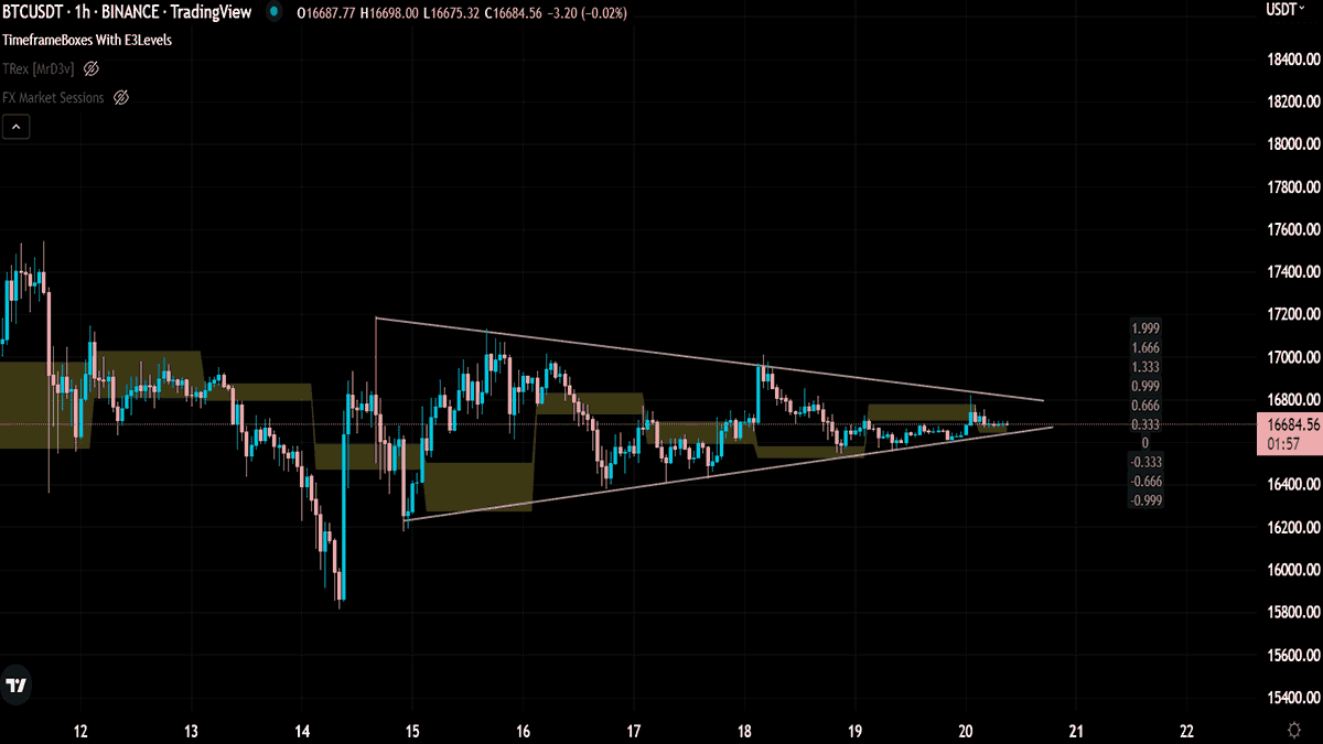 در حال حاضر قیمت در الگوی مثلث وجود دارد. درصورتیکه ضلع پایین الگو در محدوده 16500 شکسته شود انتظار افت قیمت را تا سطح 16250 و 15800 داریم و اگر قیمت ضلع بالایی الگو را در سطح 16800 بشکند انتظار رشد قیمت را تا سطح 17400 و 17800 داریم.