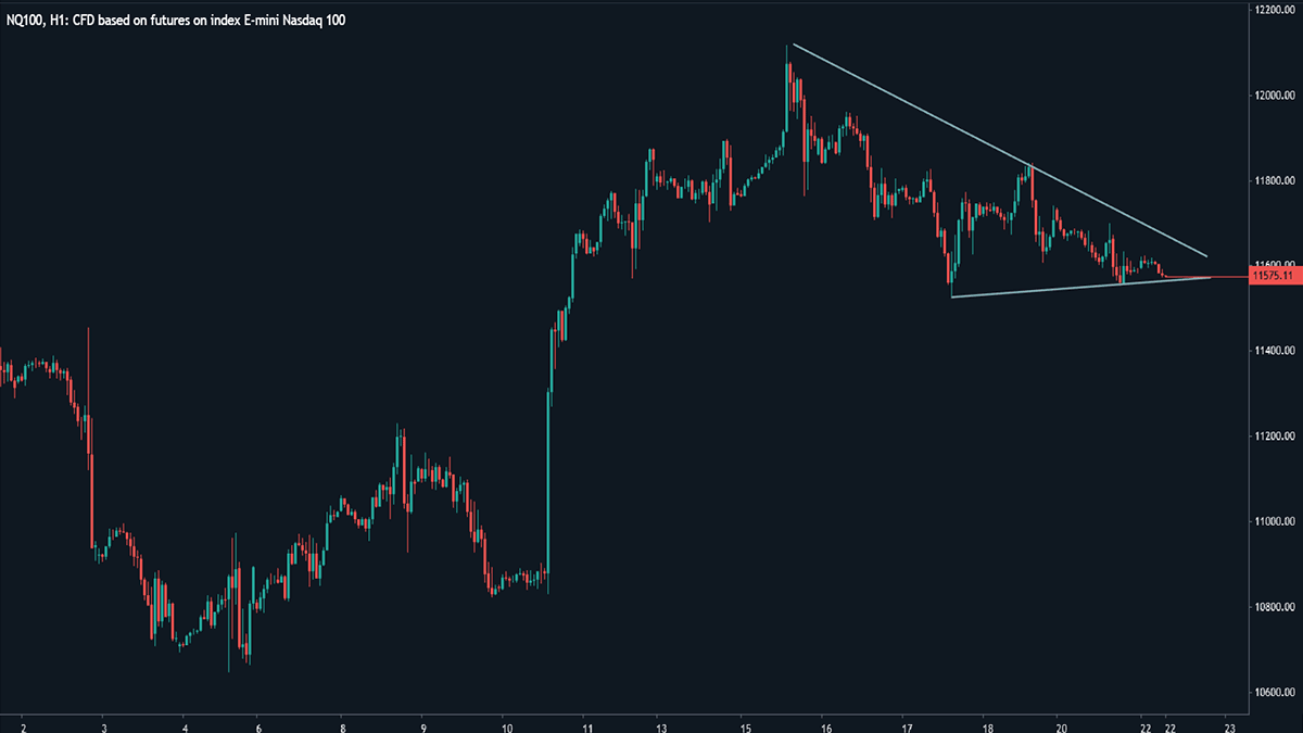 قیمت پس از یک حرکت صعودی، از ادامه حرکت بازمانده و وارد فاز اصلاحی شده و در یک الگوی مثلث و در نزدیکی سطح حمایتی 11550 قرار دارد. انتظار داریم با شکست این سطح تا محدوده 11450 و 11200 به مسیر نزولی خود ادامه دهد.