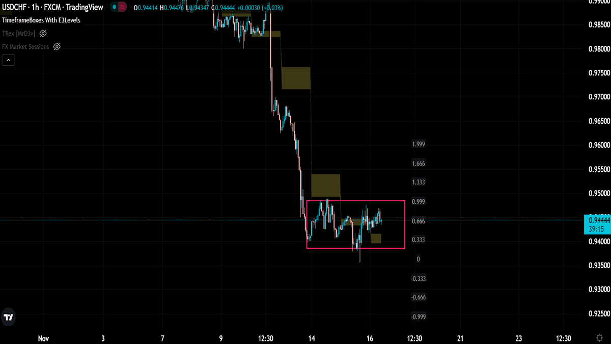 قیمت پس از یک روند شارپ نزولی، وارد الگوی مستطیل شده است. درصورتیکه سقف الگو در قیمت 0.9495 شکسته شود انتظار برگشت قیمت تا سطح 0.9540 را داریم. اما اگر کف الگو در قیمت 0.9380 شکسته شود انتظار ادامه ریزش قیمت را تا سطح 0.9330 و 0.9290 داریم.